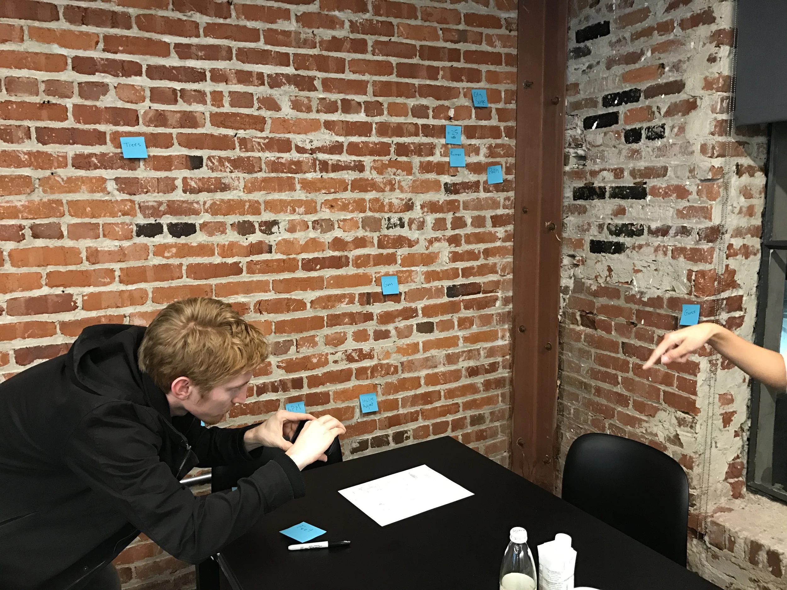 Designing for 3D using sticky notes on a wall to aid in visualization.